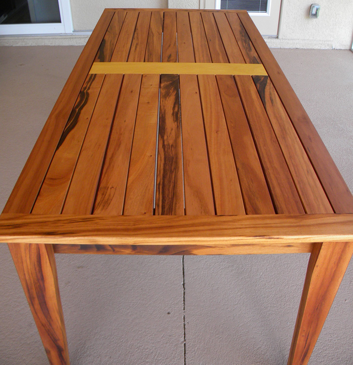 The Tigerwood dining table was created from 4" solid square columns and 2-3/4" slats that are 1" thick for the top. The aprons were also fabricated from 5/4 Tigerwood for strength across the width of the table. The tabletop design also included a 4" wide Garapa sapwood accent bridge that was also 1" thick. The accent bridge transfers any loads from the slat top into the aprons and finally to the legs. All of the tables joints were fashioned from internal Mahogany tenons.