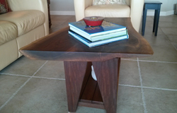 This custom coffee table was made specifically for a gulf coast condominium where space was a key consideration. The homeowner wanted a unique yet functional table for a rental unit that would get a lot of wear and tear. With these specifications in mind, we designed this coffee table which features a live-edge walnut top and coordinating Brazilian walnut (ipe) trestle base with a bottom shelf for displaying her favorite books and magazines.